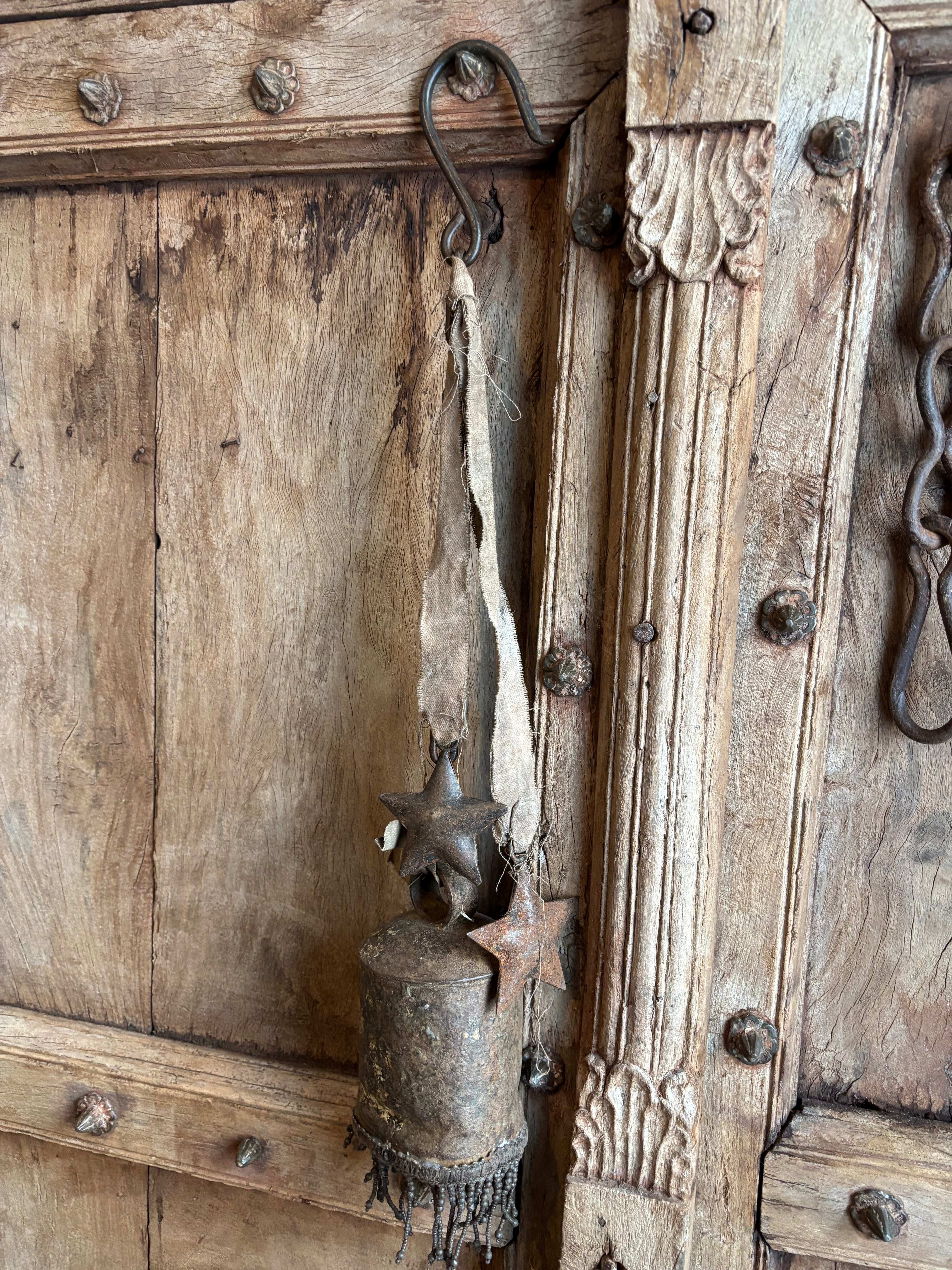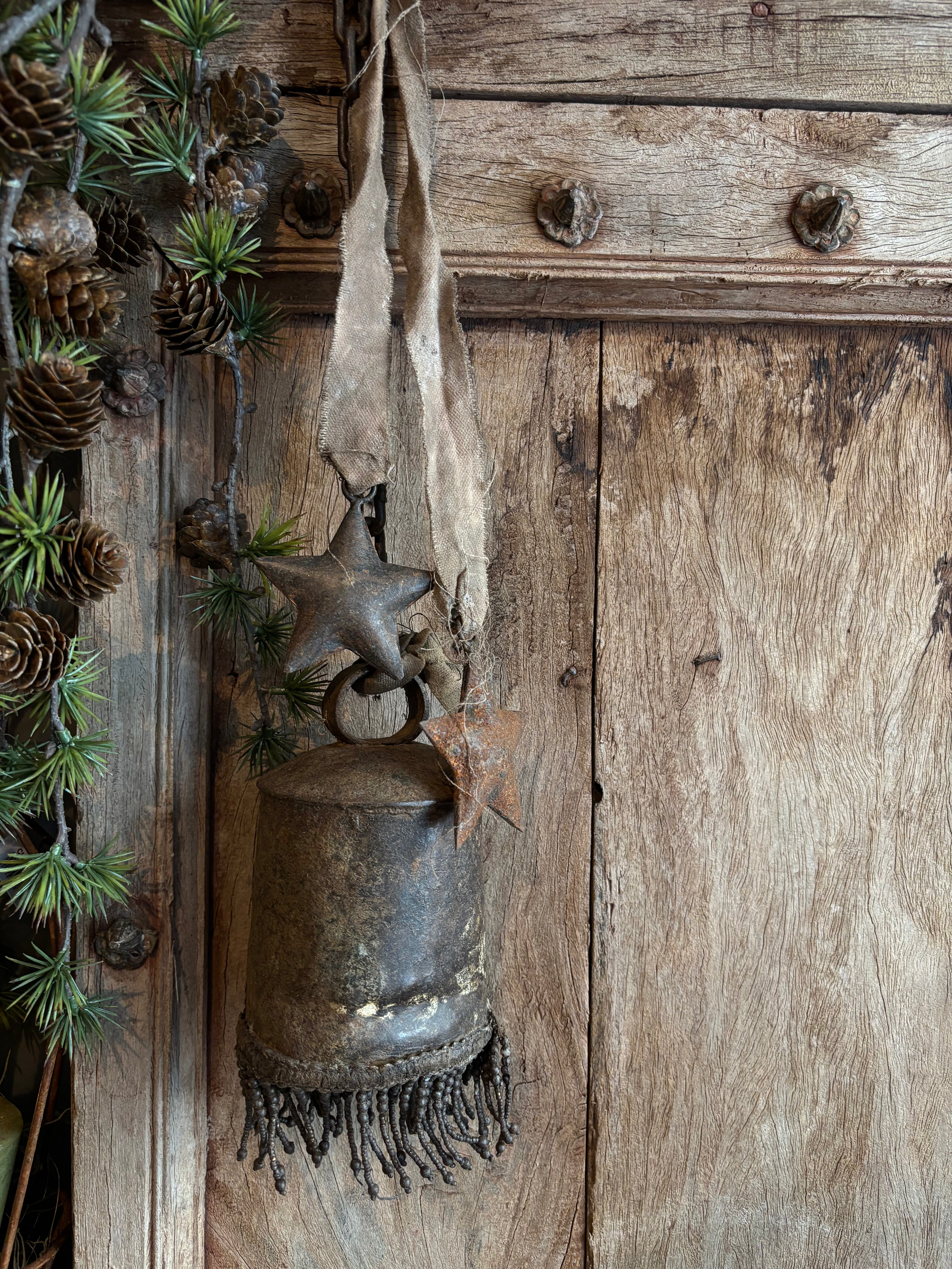 Koeienbel met sterren aan shabby linten aan haak. Elke bel is geleefd en uniek, maat en kleur kunnen afwijken! Totale lengte 55cm, alleen een bel 17cm.